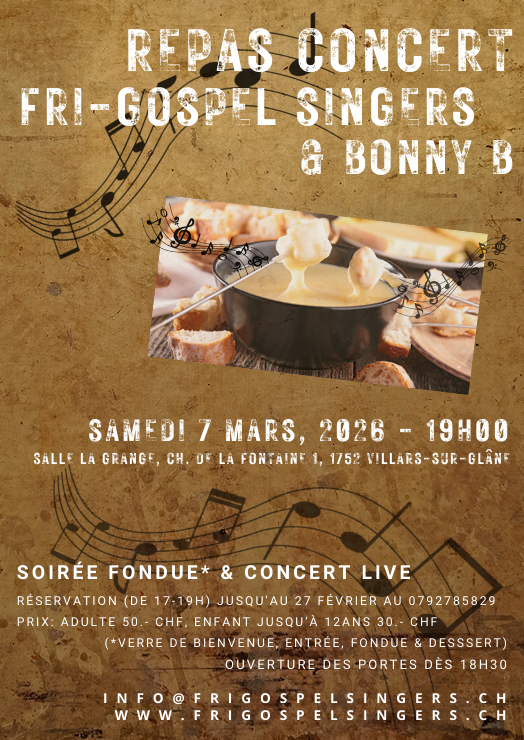 7 mars 2026 (19h) Fri-Gospel Singers & Bonny B. - Repas Concert - La Grange, Villars-sur-Glâne ➙carte