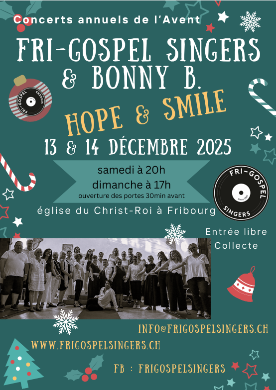 13 décembre 2025 (20h) Fri-Gospel Singers & Bonny B. - Concert de l'Avent - église du Christ-Roi à Fribourg Collecte ➙ carte