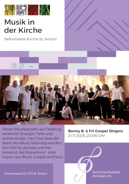 21 novembre 2025 (20h) FRI-GOSPEL SINGERS & BONNY B. CONCERT DE GOSPEL église réformée de St. Antoni (Singine) ➙ carte